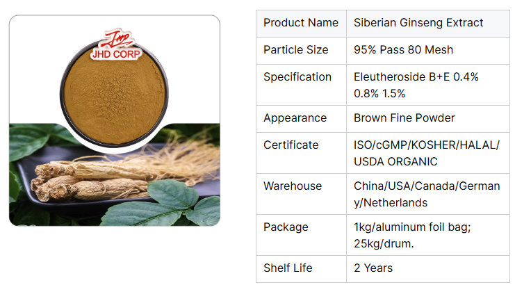 Siberian Ginseng Extract, also known as Eleutherococcus senticosus extract, is a natural herbal supplement extracted from the roots and stems of Siberian ginseng. The main active ingredient of Siberian ginseng extract is eleutherosides, among which eleutherosides B and E are the most studied components.