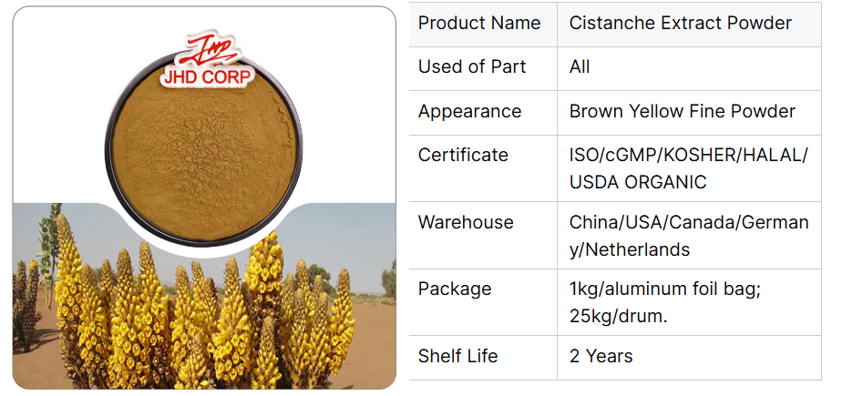 Cistanche Extract Powder is mainly derived from Cynomorium plants, such as Cistanche tubulosa, etc. These plants mostly grow in arid areas such as deserts. Their unique growth environment makes them rich in active ingredients, such as echinacoside and verbascoside.