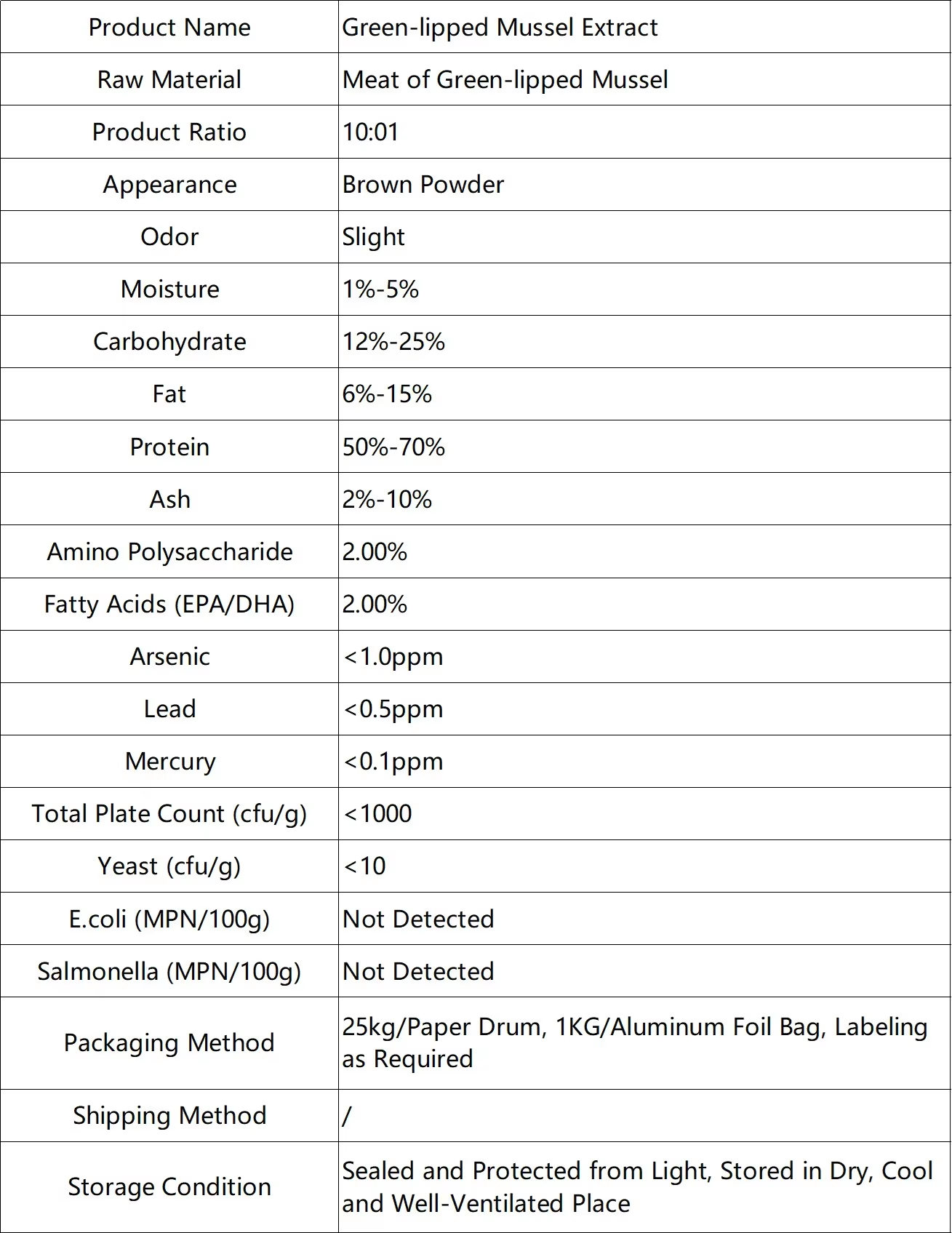 Green Lip mussel extract is a dietary supplement derived from mussel tubules in New Zealand. It is known for its potential health benefits, especially in terms of joint health and antioxidants. The extract is usually extracted from mussel meat and then processed into a concentrated powder or oil. Green-lipped mussel extract is rich in various nutrients and bioactive compounds that contribute to its health-promoting effects. It contains omega-3 fatty acids such as eicosapentaenoic acid (EPA) and docosahexaenoic acid (DHA).